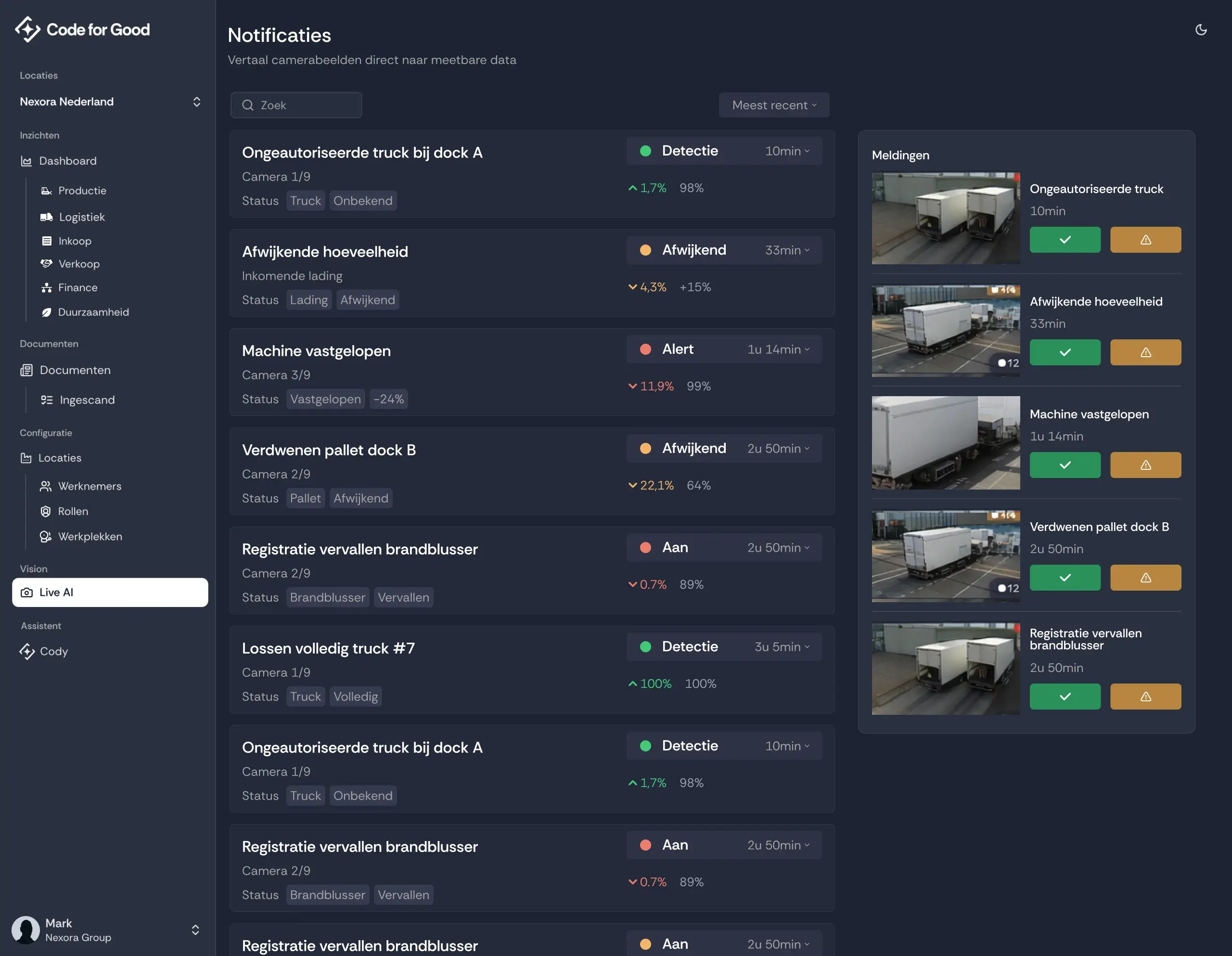 Breid het platform uit met visuele intelligentie voor productie, logistiek en duurzaamheid. Onze camera-algoritmen kijken mee op de werkvloer om processen foutloos en sneller te laten verlopen.